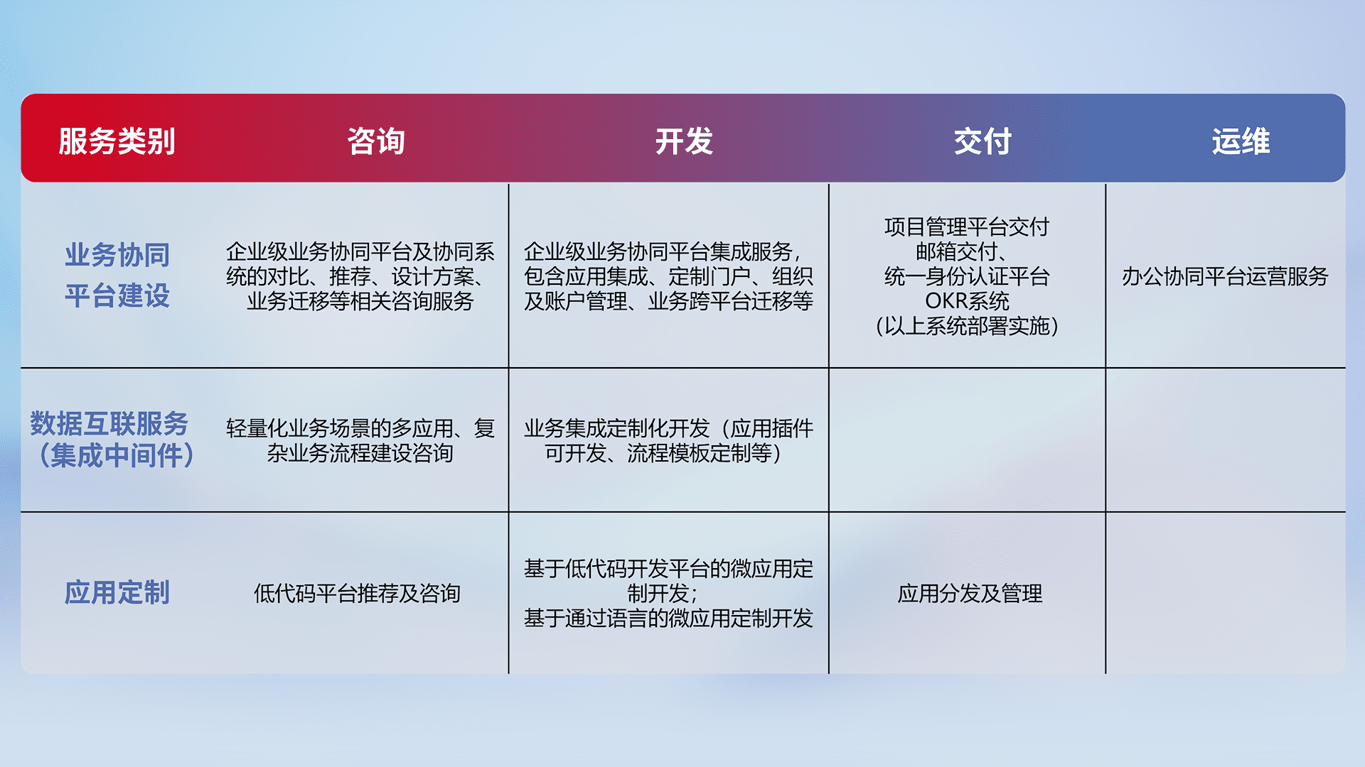 针对钉钉、、企微、、IDaas等平台级产品提供产品的规划、、、、方案、、、交付、、定制化开发等服务,,,,实现如统一协同办公、、智能客户服务、、混合会议管理、、智能数据查询、、等业务场景,,,实现数字化转型。。