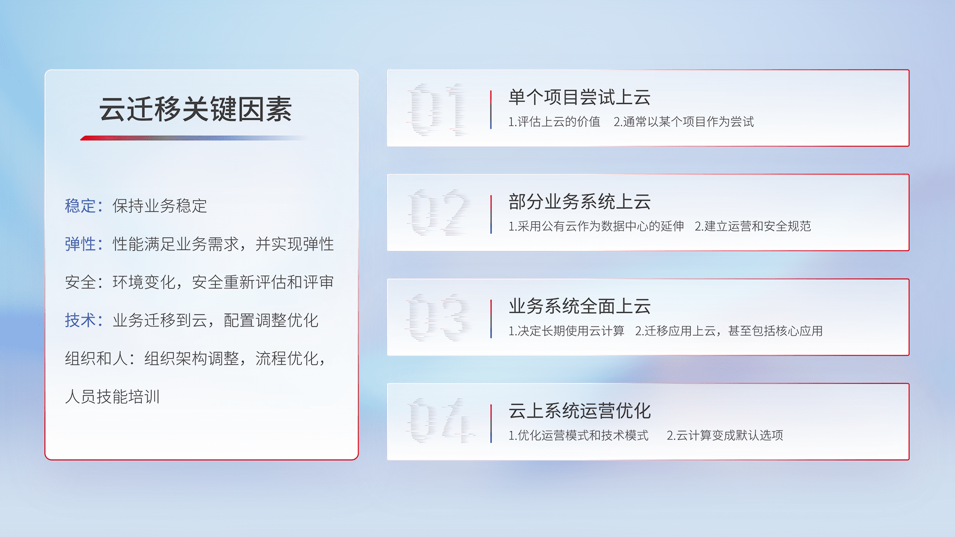 结合实际业务,,从规划设计、、、、云平台选型、、、、云原生改造、、数据迁移、、、集成交付,,,迁移全过程为客户识别最佳上云路径,,做好风险识别管理,,设计网络架构、、、、身份权限、、安全审计合规、、、操作审计、、日志审计、、、、监控告警策略、、多站点容灾设计等,,,,对云上基础设施进行整体规划,,,提升IT治理水平,,以满足弹性、、、高可用、、、、高性能的需求。。。。
