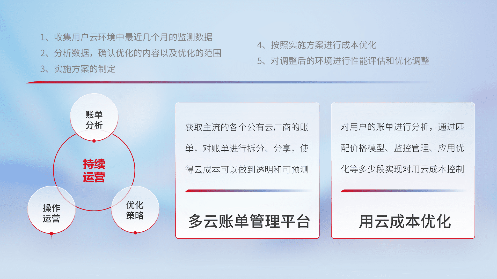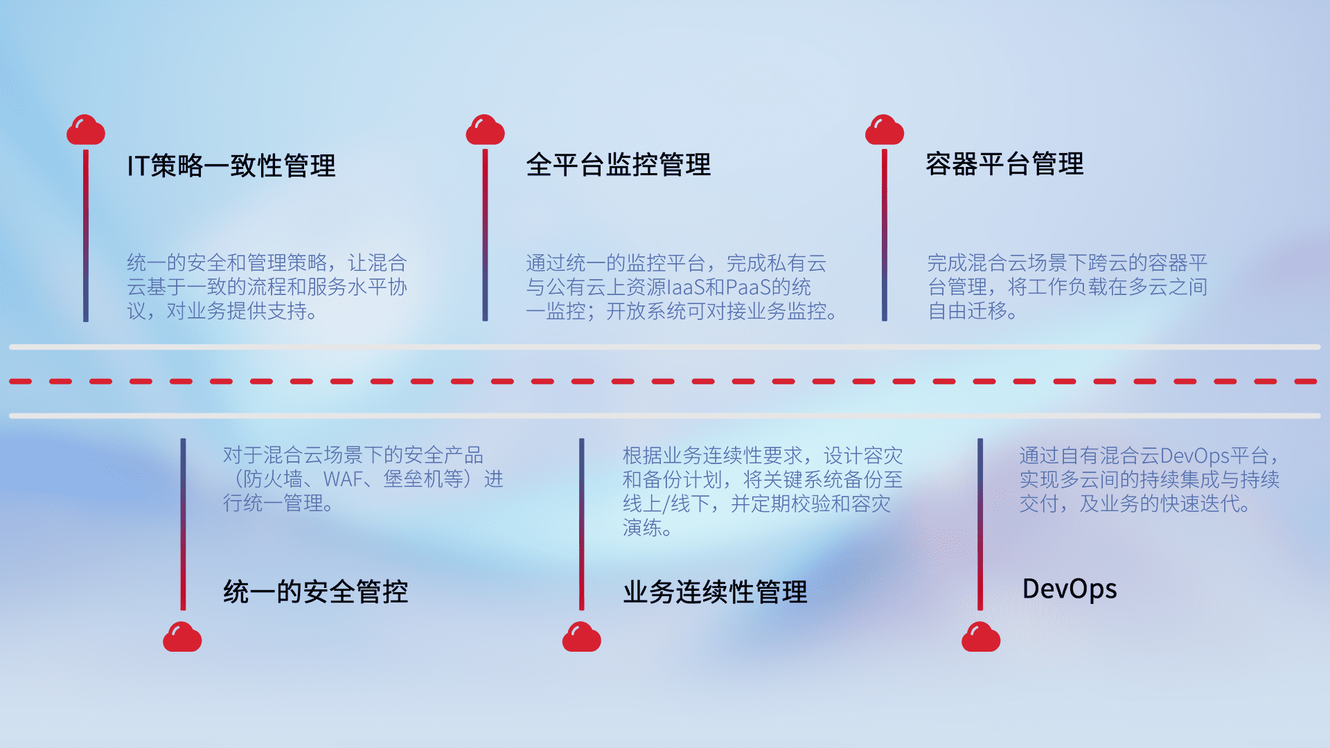 通过多云纳管,,,,以统一的资源数据模型把客户的云资源进行抽象和封装,,,进而实现对多云资源的统一操作,,,,保障云资源管理的可靠性、、、、稳定性与可用性。。。。量身定制化运维内容,,,配置、、、开发运维、、、补丁管理、、、、备份、、、、监控、、、认证和访问管理、、、审计和日常巡检等,,保障在用云过程中的可靠度,,,稳定度以及高可用率。。。